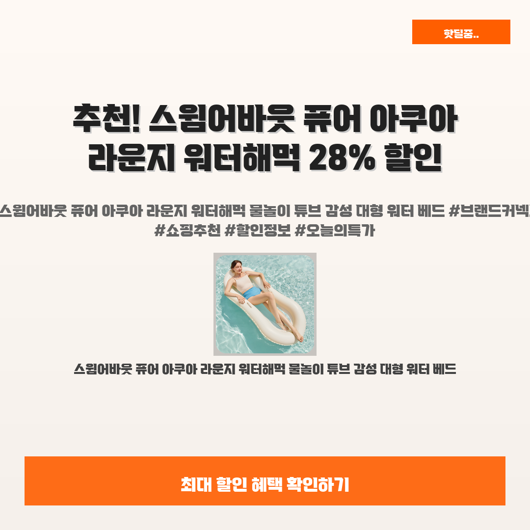 🛍️ 이 포스팅은 네이버 쇼핑 커넥트 활동의 일환으로,판매 발생 시 수수료를 제공받습니다.여름을 제대로 즐길 준비 되셨나요?오늘 소개할 제품은 스윔어바웃 퓨어 아쿠아 라운지 워터해먹, 그야말로 휴가철 물놀이의 필수 아이템이에요!수영장이나 해변에서 시원한 물속에 떠다니며 완벽한 Relax를 원한다면, 단연코 이 대형 워터 베드가 정답이에요."여름이지만 시원한 곳이 없을까?"라는 고민을 해결해줄 네임드 브랜드 스윔어바웃의 제품으로 물놀이의 진수를 느껴보세요!그리고 지금 할인도 진행 중이니, 가성비까지※ 이거 진짜 제가 직접 써보고 쓰는 리뷰예요 광고 아님!!스윔어바웃 퓨어 아쿠아 라운지 워터해먹 물놀이 튜브 감성 대형 워터 베드28% 34,900원24,900원스윔어바웃 지금 구매하기 → ⭐ 스윔어바웃 퓨어..