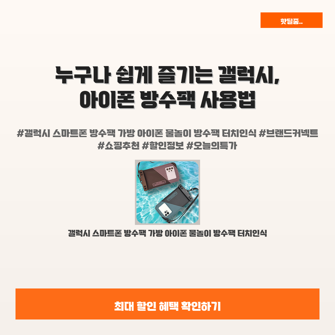 🛍️ 이 포스팅은 네이버 쇼핑 커넥트 활동의 일환으로,판매 발생 시 수수료를 제공받습니다.여름을 즐기는 필수 아이템!누구나 쉽게 즐기는 갤럭시 스마트폰 방수팩 가방 아이폰 물놀이 방수팩 터치인식을 소개합니다.여름 물놀이의 아찔한 순간, 소중한 스마트폰을 물속에서 잃어버리는 걱정, 정말 싫죠? 이젠 걱정하지 마세요!"갤럭시 스마트폰 방수팩 가방 아이폰 물놀이 방수팩 터치인식"이 당신의 스마트폰을 안전하게 지켜줍니다.이 방수팩은 편리한 터치 인식 기능을 갖추고 있어 물속에서도 자유롭게 스마트폰을 사용할 수 있어요!친구들과 함께 하는 즐거운 물놀이에서 소중한 순간을 그대로 간직할 수 있답니다.게다가 현재 한정 특가로 9,900원에 구매 가능하니, 놓칠 수 없는 기회예요. 물놀이를 더욱 즐겁게 만들어줄 이 제..