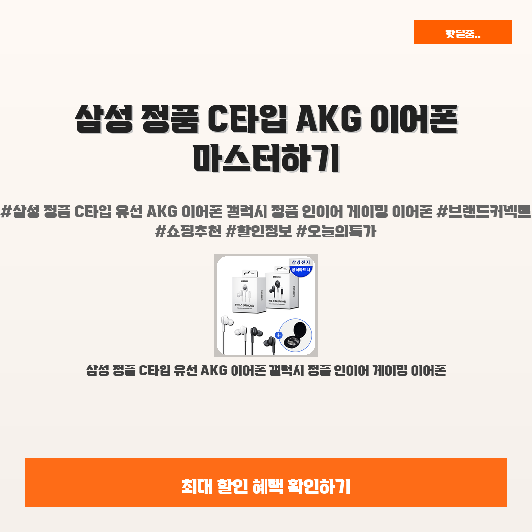 🛍️ 이 포스팅은 네이버 쇼핑 커넥트 활동의 일환으로,판매 발생 시 수수료를 제공받습니다.오늘 소개할 제품은 단연코,,바로 삼성 정품 C타입 유선 AKG 이어폰입니다!요즘 고음질 이어폰을 찾는 분들이 정말 많은데요, 다들 경험해보신 적 있으시죠? 신뢰할 수 있는 브랜드의 상품을 사용하고 싶지만 또 가격도 부담스러운 경우. 그런 여러분께 딱 맞는 해결책이 여기 있습니다.이 삼성 정품 C타입 유선 AKG 이어폰은 높은 가성비와 뛰어난 성능을 자랑합니다. 직접 사용해보시면,음악의 세계가 확 달라지는 기분을 느끼실 거예요. 강력한 사운드와 편안한 착용감은 어떤 상황에서도 여러분의 음악 경험을 한층 더 풍부하게 만들어줄 것입니다.게다가 지금 놀라운 할인율 45%로 만나볼 수 있으니, 이 기회를 절대 놓치지 마세..