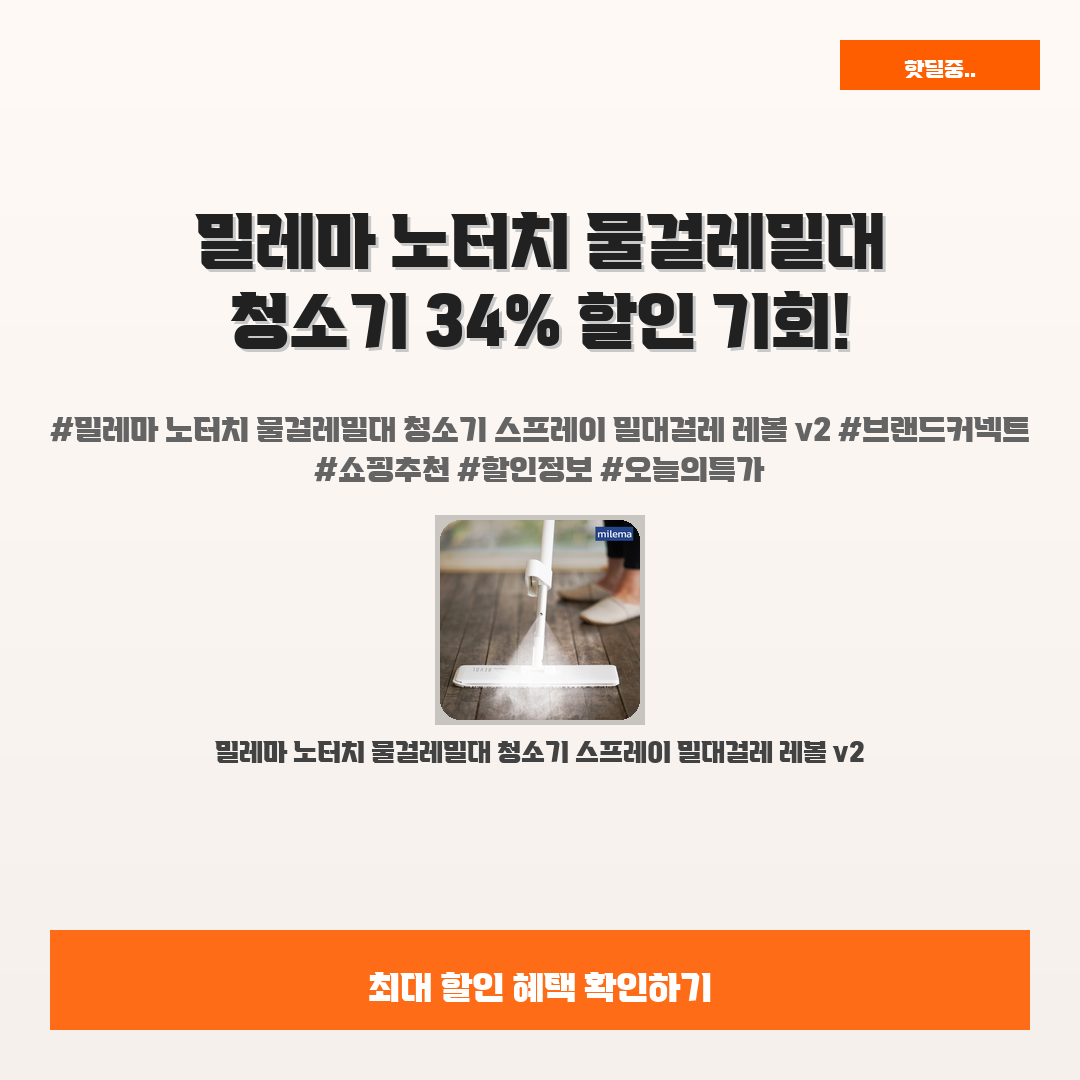 🛍️ 이 포스팅은 네이버 쇼핑 커넥트 활동의 일환으로,판매 발생 시 수수료를 제공받습니다.오늘 소개할 제품은 단연코,,바로 밀레마 노터치 물걸레밀대 청소기 스프레이 밀대걸레 레볼 v2 입니다!집 안 청소할 때마다 허리 아프고 힘든가요? 밀레마 노터치 물걸레밀대 청소기가 그 고민을 해결해 줄 것입니다! 저렴한 가격에 효과적인 청소가 가능하니, 가시적인 결과를 느껴보세요.이 제품을 사용하면 청소 시간이 단축되고, 더욱 깔끔한 공간을 만들 수 있습니다. 특히 지금 34% 할인된 가격으로 제공되니, 기회를 놓치지 마세요!가성비가 뛰어난 이 청소기를 통해, 행복한 청소 경험을 누려보세요. 정말 후회하지 않을 제품이랍니다!※ 이거 진짜 제가 직접 써보고 쓰는 리뷰예요 광고 아님!!밀레마 노터치 물걸레밀대 청소기 ..