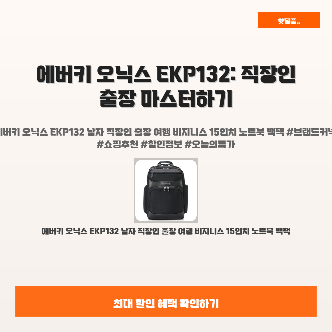 🛍️ 이 포스팅은 네이버 쇼핑 커넥트 활동의 일환으로,판매 발생 시 수수료를 제공받습니다.오늘 소개할 제품은 단연코,,바로 에버키 오닉스 EKP132 남자 직장인 출장 여행 비지니스 15인치 노트북 백팩입니다!직장인 여러분, 출장과 여행의 불편함 느껴본 적 있으신가요?“노트북과 필수 아이템, 이런 백팩에 담아 이동하면 얼마나 편할까?”그렇다면 이 제품이 적중할 것입니다.에버키 오닉스 EKP132는 여행 중 생기는 다양한 고민을 해결해주는데 완벽한 백팩이에요!정확히 필요한 공간과 모던한 디자인으로 출장 업무도 스타일리시하게 할 수 있답니다.더구나 30% 할인으로 단 315,000원!이젠 출장도 부담 없이 즐길 수 있을 거예요. 조금의 결정으로 큰 변화를 체험해보세요!에버키 오닉스 EKP132 남자 직장인..