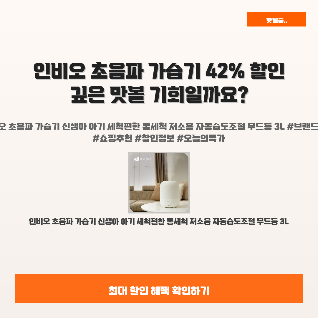 🛍️ 이 포스팅은 네이버 쇼핑 커넥트 활동의 일환으로,판매 발생 시 수수료를 제공받습니다.오늘 소개할 제품은 단언컨데,,그야말로 완벽한, 갓벽한, 감동적인 제품이라구요요즘 공기가 건조해서 불안하신 부모님들, 아기 건강을 염려하시는 분들께 강력 추천하는 "인비오 초음파 가습기"가 등장했습니다!신생아와 아기를 위한 세척 편리함과 저소음 등 다양한 기능으로 가득합니다.자동으로 습도를 조절해주는 이 가습기로 여러분의 소중한 아기를 더욱 건강하게 지켜줄 수 있어요. 유아의 편안한 수면 환경을 만들어주세요!그리고 무드등 기능까지 탑재되어 있어 침실에서도 아늑한 분위기를 자아낸답니다.지금이라면 42% 할인된 가격으로 만나볼 수 있으니, 고민하지 말고 행복한 가습기 생활을 시작해보세요!저도 이 제품 덕분에 아기의 건..